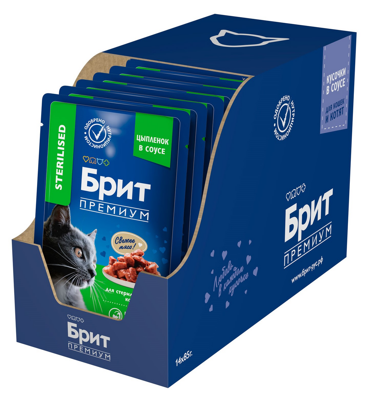 Нежные кусочки куриного филе в ароматном соусе однозначно заинтересуют Вашу кошку и станут любимым блюдом для нее. Ведь в паучах Брит Premium Fillets in Gravy содержится до 82% мяса! Влажный корм Брит Premium содержит все необходимые для полноценного питания наших любимцев витамины и минералы.