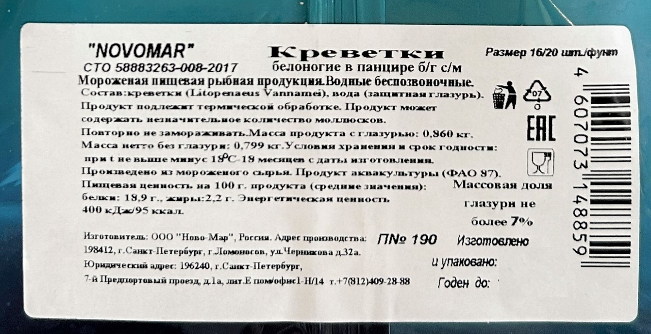 Креветки Novomar без головы свежемороженные 16/20, 860г