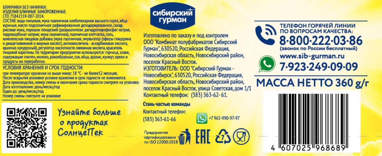 Блины Сибирский Гурман Солнцепек без начинки замороженные (45г x 8шт), 360г
