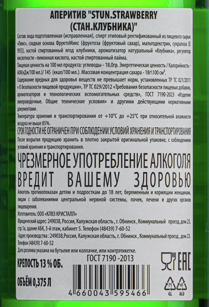 Вода подготовленная (исправленная), спирт этиловый ректификованный из пищевого сырья Люкс, сладкая основа ФруктоМикс (фруктоза (фруктовый сахар), мальтодекстрин, сукралоза E955)), настой спиртованный ягод клубники, ароматизатор натуральный Клубника, регулятор кислотности - лимонная кислота, настой спиртованный лайма.