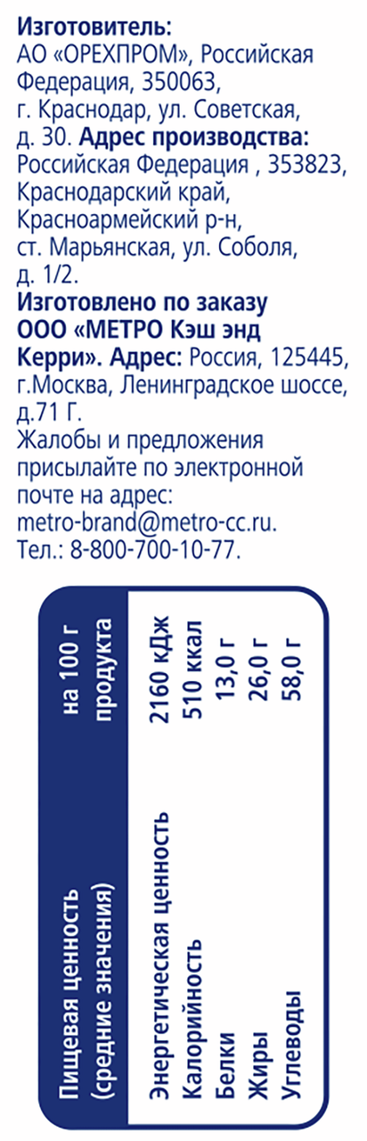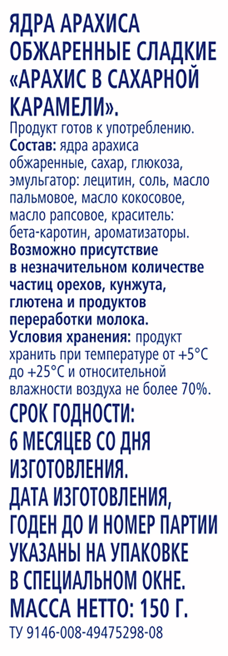 Арахис METRO Chef в карамели, 150 г – обжаренные в сладком сиропе орешки аппетитного вида, которые понравятся и детям, и взрослым. Земляной орех содержит большое количество необходимых для организма кислот, минералов и витаминов. При регулярном употреблении он помогает в профилактике заболеваний сердечной системы, защищает клетки от преждевременного старения и уменьшает количество вредного холестерина. Арахис незаменим для активных людей – всего 50-100 г ядер в день обеспечат прилив сил, бодрость, наполнят энергией и подарят отличное настроение. Орех богат клетчаткой, благодаря чему оказывает положительное воздействие на работу органов пищеварения и нормализует функционирование ЖКТ. Арахис заключен в небольшую пачку, которая занимает минимум места и с легкостью поместится в рюкзаке или сумке. Его можно брать с собой и использовать в качестве вкусного и полезного лакомства или перекуса между длительными приемами пищи. Он быстро насыщает, устраняет чувство голода и дискомфортные опущения. Хрустящие сладкие орешки в карамели можно использовать в кулинарии. Они послужат интересным украшением пирога или кекса, а в дробленом виде хорошо подойдут в качестве начинки для блинчиков или рулетов.
