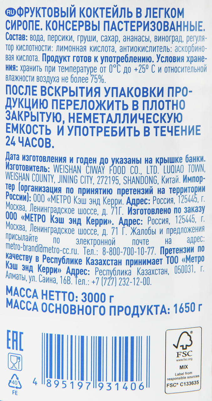Коктейль фруктовый в легком сиропе 3кг подходит для приготовления фруктовых салатов, сервировки, приготовления соусов, также и в качестве готового десерта и наполнителя для выпечки. Масса основного продукта 1650г