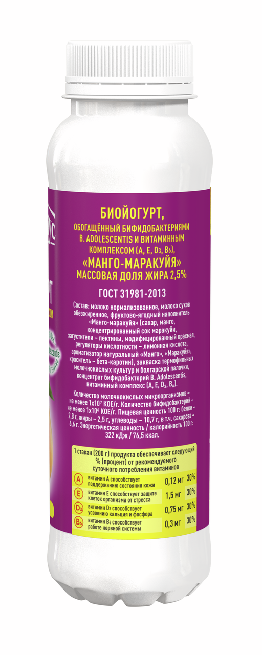 Молоко нормализованное, молоко сухое обезжиренное, фруктово-ягодный наполнитель Манго-маракуйя (сахар, манго, концентрированный сок маракуйи, загустители – пектины, модифицированный крахмал, регуляторы кислотности – лимонная кислота, ароматизатор натуральный Манго, Маракуйя, краситель – бета-каротин), закваска термофильных молочнокислых культур и болгарской палочки, концентрат бифидобактерий B. Adolescentis, витаминный комплекс (А, Е, D3, B6).
