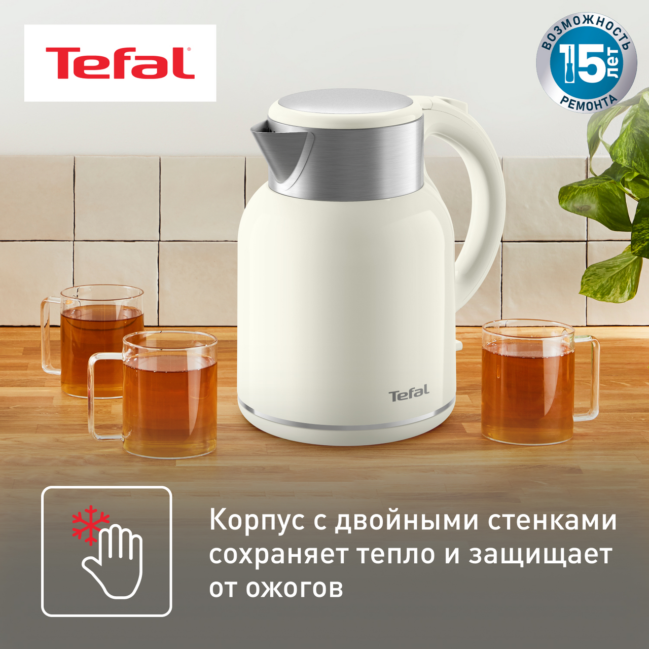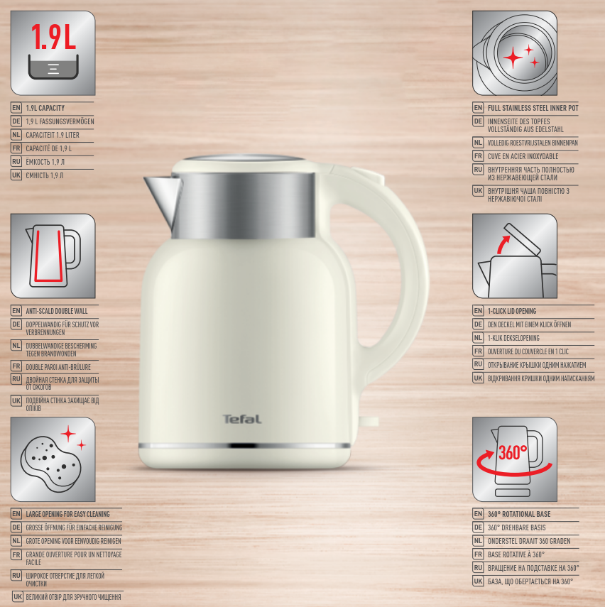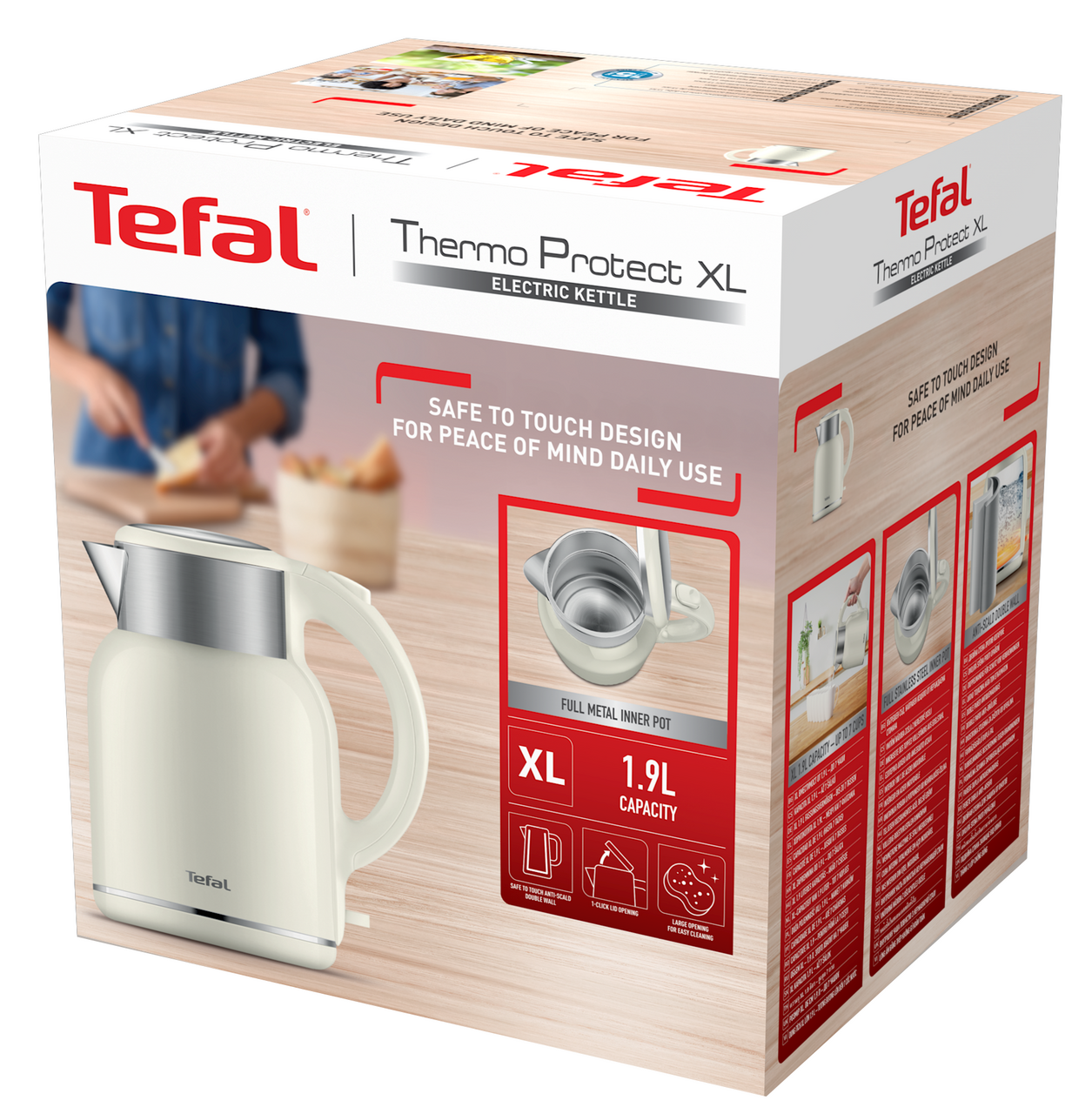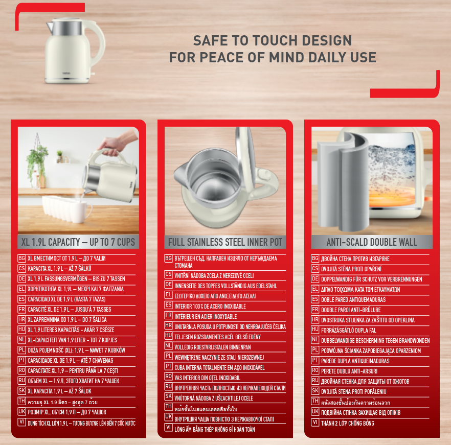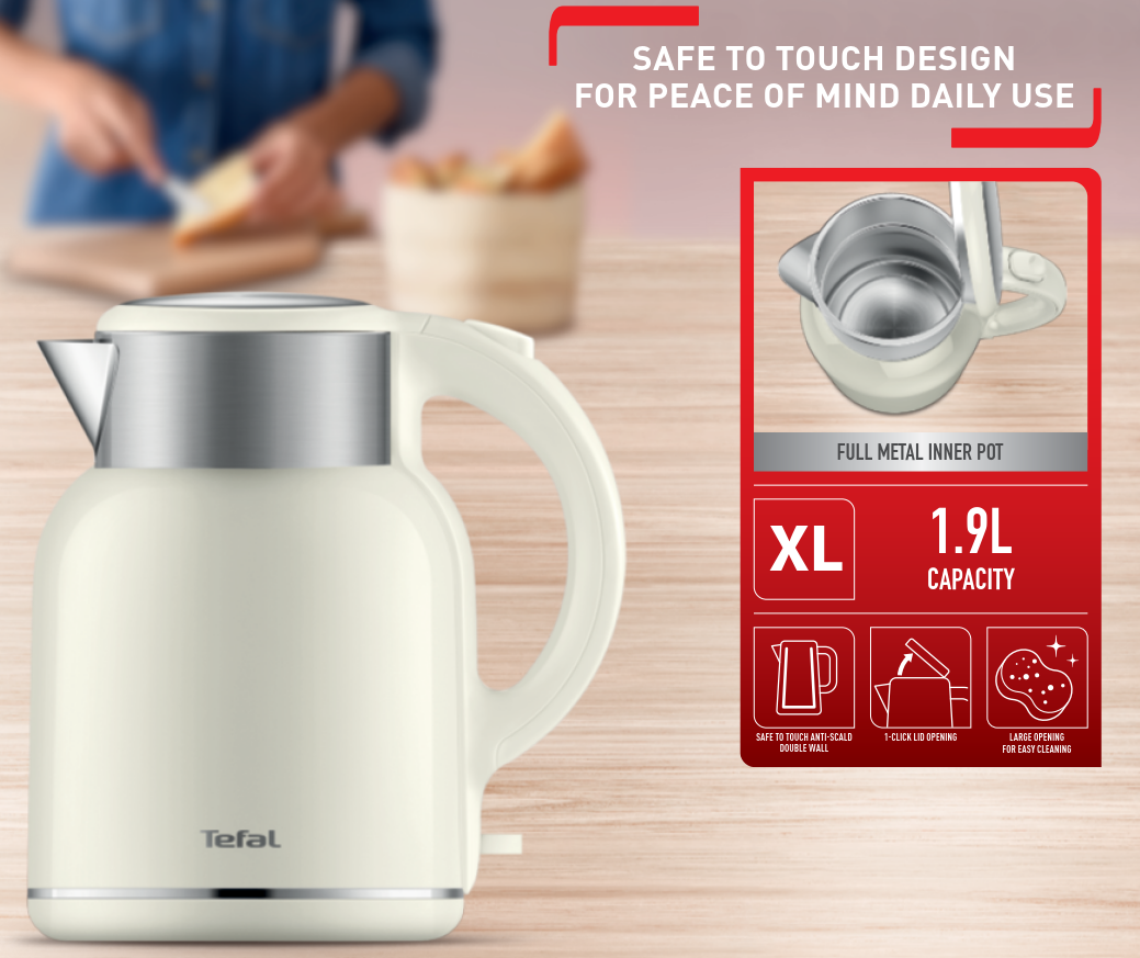 Приготовьте горячие напитки для всей семьи с электрическим чайником Thermo Protect XL от Tefal вместимостью до 7 чашек. Благодаря корпусу с двойными стенками вода внутри чайника остается горячей, а его внешнее покрытие не нагревается и безопасно для прикосновений. Широкое горлышко и скрытый нагревательный элемент облегчают чистку прибора, а автоматическое отключение и удобный носик для наливания воды без капель и брызг позволяют готовить любимые напитки с полным комфортом и спокойствием.