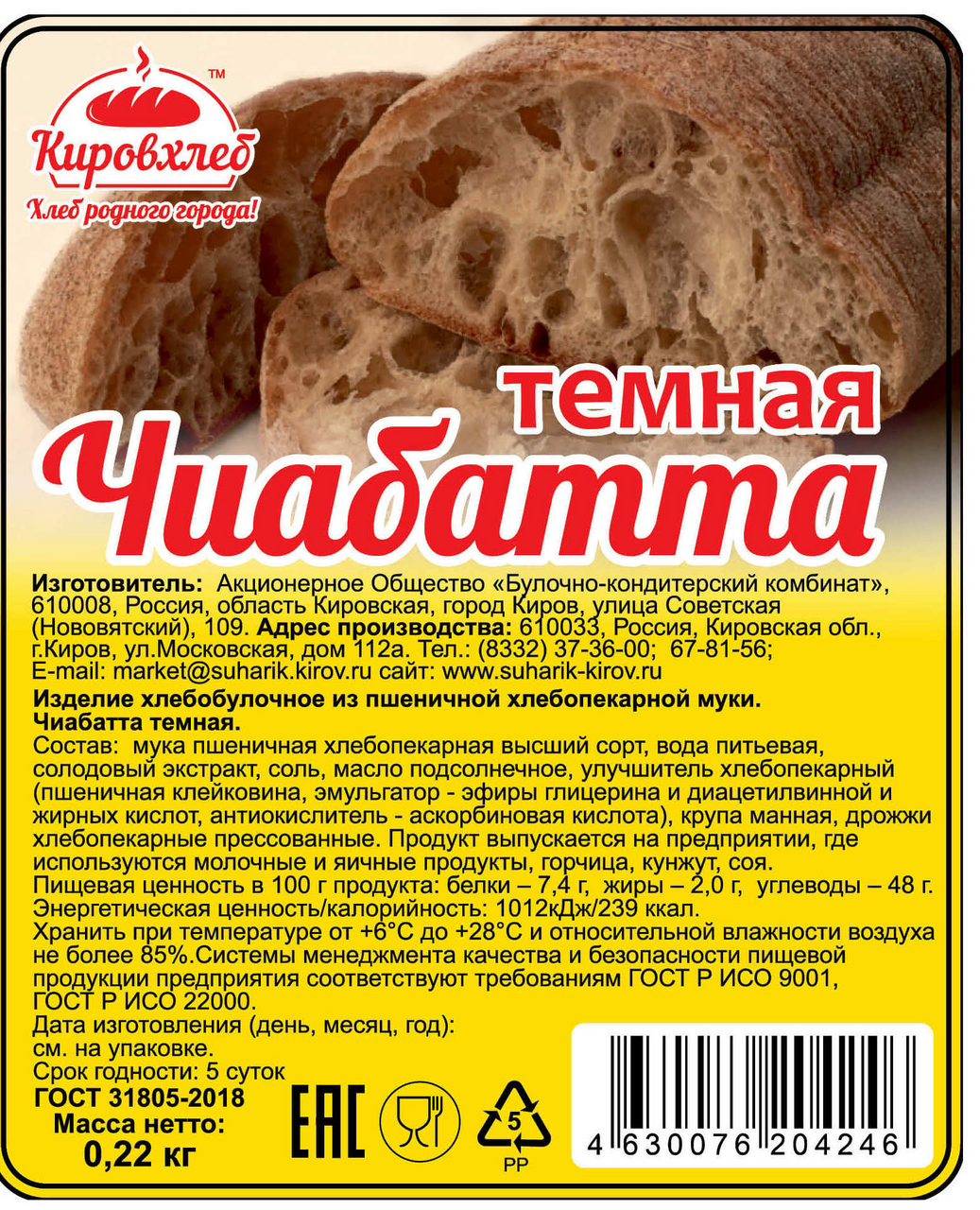 Чиабатта Кировхлеб темная, 220г