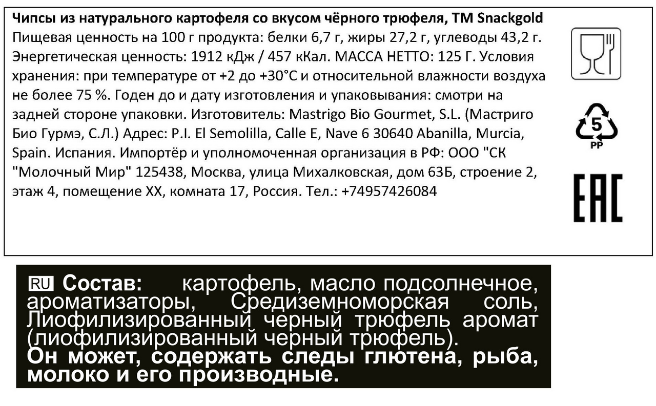 Картофель, подсолнечное масло, средиземноморская морская соль, ароматизатор, лиофилизированный черный трюфель.