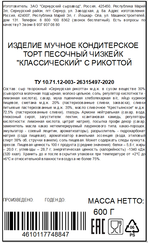 Сыр творожный Сернурская рикотта м.д.ж. в сухом веществе 30% (сыворотка молочная подсырная, молоко цельное, соль, регулятор кислотности - лимонная кислота), сахар, мука пшеничная хлебопекарная в/с, яйцо куриное пищевое, сметана м.д.ж. 20% (пастеризованные сливки, закваска), сливки питьевые пастеризованные м.д.ж. 35%, масло сливочное "Крестьянское" м.д.ж. 72,5% (пастеризованные сливки), глазурь Армони нейтральная (сахар, вода, глюкозный сироп, загустители пектин, ксантановая камедь, регуляторы кислотности лимонная кислота, цитрат натрия), посыпка профи декор (сахар заменитель масла какао нетемперируемый лауринового типа какао-порошок, эмульгатор - соевый лецитин, ароматизаторы), разрыхлитель - гидрокарбонат натрия (сода пищевая), ароматизатор ванильная эссенция (вода, этиловый спирт 38%, стручки ванили), соль пищевая.