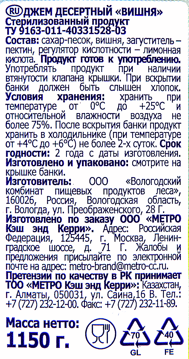Джем десертный METRO Chef Вишня, 1150 г – полезный и вкусный продукт, который обладает сбалансированным, приятным, кисло-сладким вкусом спелой сочной вишни и густой консистенцией. Благодаря хорошей текстуре джем легко намазывается на хлеб, тосты, подойдет для промазывания коржей для тортов. Вишневый джем упакован в стеклянные баночки с завинчивающейся крышкой. Свежесть данного продукта определяется сроком годности, указанном на этикетке и характерным щелчком, который издает крышка при первом открывании.