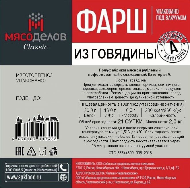 Фарш из говядины Мясоделов охлажденный, 2кг