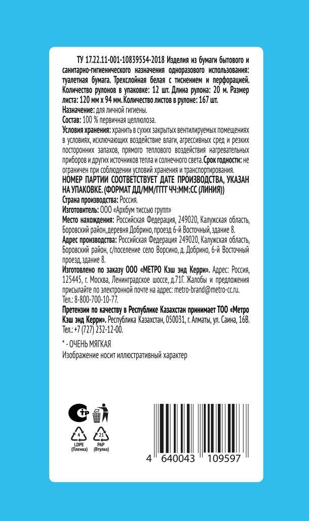 Трехслойная туалетная бумага из 100% целлюлозы. Без аромата. Упаковка оснащена перфорацией для легкого открытия.