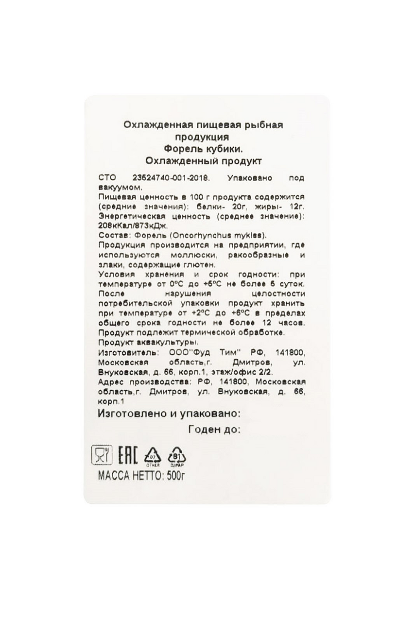 Благородная представительница семейства лососевых. Выращивается в Баренцевом море. Ее красное мясо обладает легкой маслянистой текстурой и нежным изысканным вкусом. Подходит для тушения, варки, приготовления на пару, запекания, жарки, копчения. Форель также едят в слабосоленом и сыром виде. Из нее можно сделать изумительный тартар, суши, хе и другие блюда.