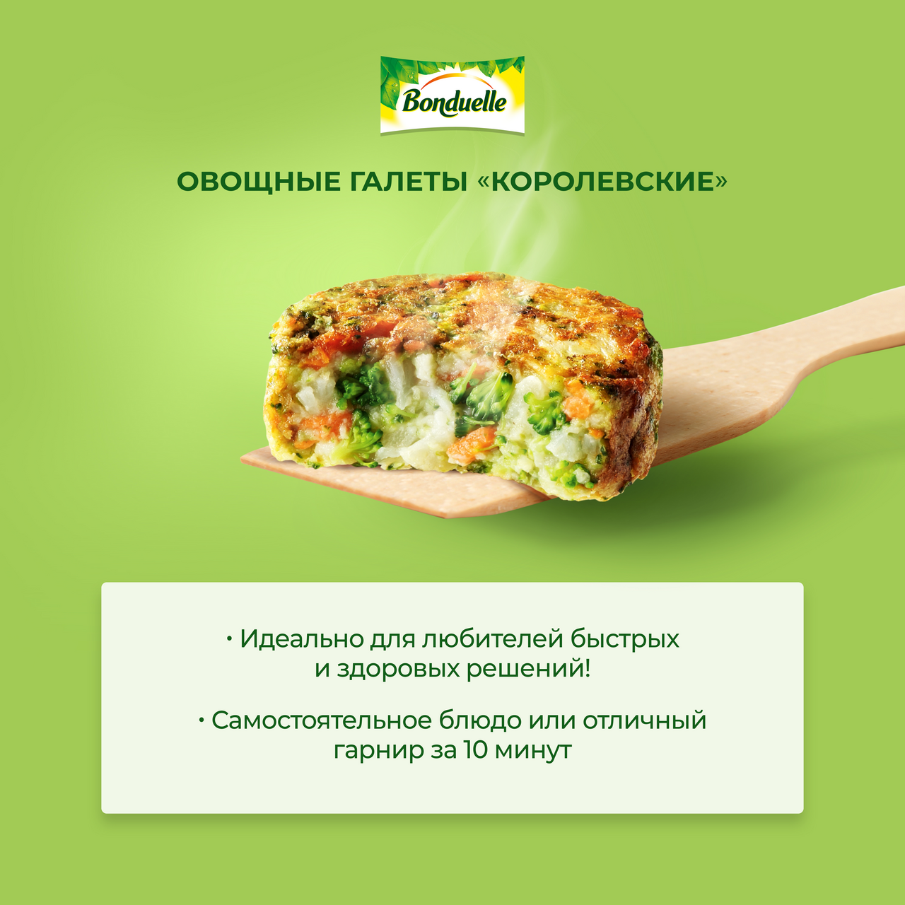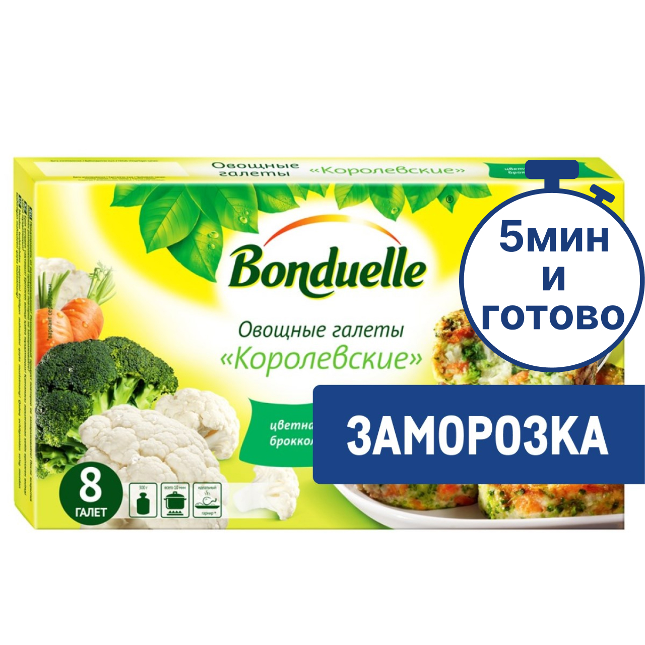 Галеты Бондюэль – это возможность легко ввести в меню овощи, богатые витаминами, минералами и клетчаткой. Микс цветной капусты, брокколи, моркови и ароматных специй. Достаете из пачки не размораживая, обжариваете 7 минут на сковороде – и полезный ужин готов. Кстати, галеты можно есть и на завтрак, добавив их на тарелку к привычной яичнице.