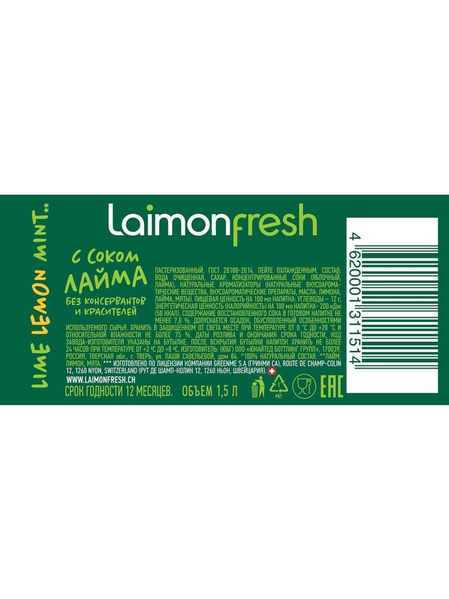 Laimon fresh в большой семейной бутылке 1,5 л. - это безалкогольный напиток средней газации, приготовленный из 100% натуральных ингредиентов. В его составе - только очищенная вода, концентрированные соки и масла. Оригинальное сочетание лайма, лимона и ароматной мяты, идеально сбалансировано и создает уникальный вкус, который невозможно повторить. Напиток не содержит искусственных красителей, ароматизаторов и консервантов.