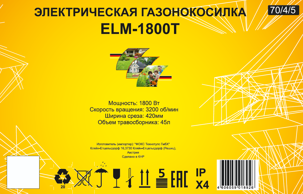 Газонокосилка электрическая ELM-1800T Huter. Современное и надежное устройство для стрижки газона на небольших по размерам территориях. Оснащена мощным двигателем на 1800 Вт с 3200 оборотами в минуту. Поддерживает высоту среза от 20 до 55 мм. Увеличенная ширина среза за проход 420 мм позволяет быстрее подстричь лужайку. Модель оснащена объемным тканевым травосборником на 45 литров. Кроме того, доступна центральная регулировка высоты среза, её удобство в том, что она настраивается движением одного рычага. Стоит выделить компактную конструкцию Huter ELM-1800T, что делает возможным использование инструмента в условиях ограниченного пространства. Корпус газонокосилки изготовлен из легкого, долговечного пластика. Нож обладает длительным сроком службы, что стало возможным благодаря использованию прочных сплавов стали в его составе. Электрогазонокосилка обладает несколькими весомыми преимуществами по сравнению с аккумуляторными и бензиновыми вариантами устройства. Во-первых, она не требует сложного обслуживания, как бензиновая техника. Во-вторых, её работа не ограничена по времени и не зависит от заряда АКБ. Но есть и недостаток – электрическая газонокосилка менее мощная, чем бензиновая, поэтому не подходит для обработки больших территорий.