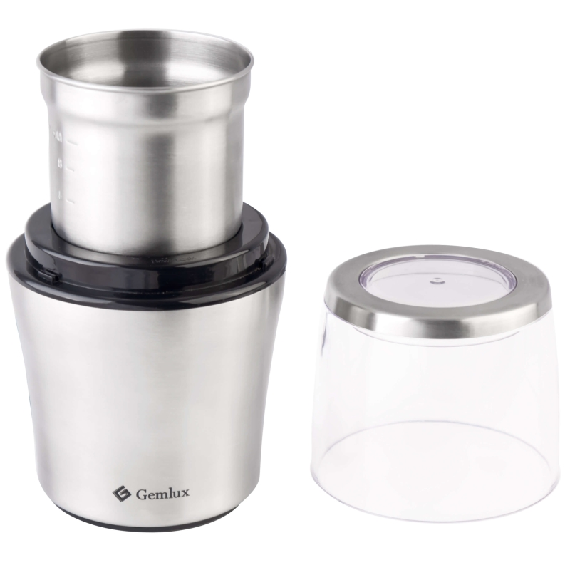 Измельчитель Gemlux GL-CG999A совмещает в себе функции кофемолки и мини-чоппера. Устройство оснащено двумя съемными чашами емкостью 300 мл из нержавеющей стали: чаша-кофемолка с 2-лопастным ножом, чаша-измельчитель с 4-лопастным ножом. Запуск двигателя происходит при нажатии на крышку чаши. Чаша-кофемолка измельчает за один прием 70-100 г зернового кофе. Степень помола (от грубого для френч-пресса до тонкого для турки) зависит от длительности работы устройства.