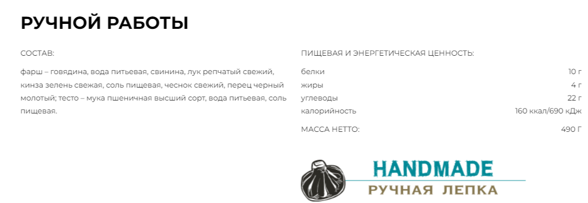 Фарш: говядина, вода питьевая, свинина, лук репчатый свежий, кинза зелень свежая, соль пищевая, чеснок свежий, перец чёрный молотый; тесто: мука пшеничная высший сорт, вода питьевая, соль пищевая.