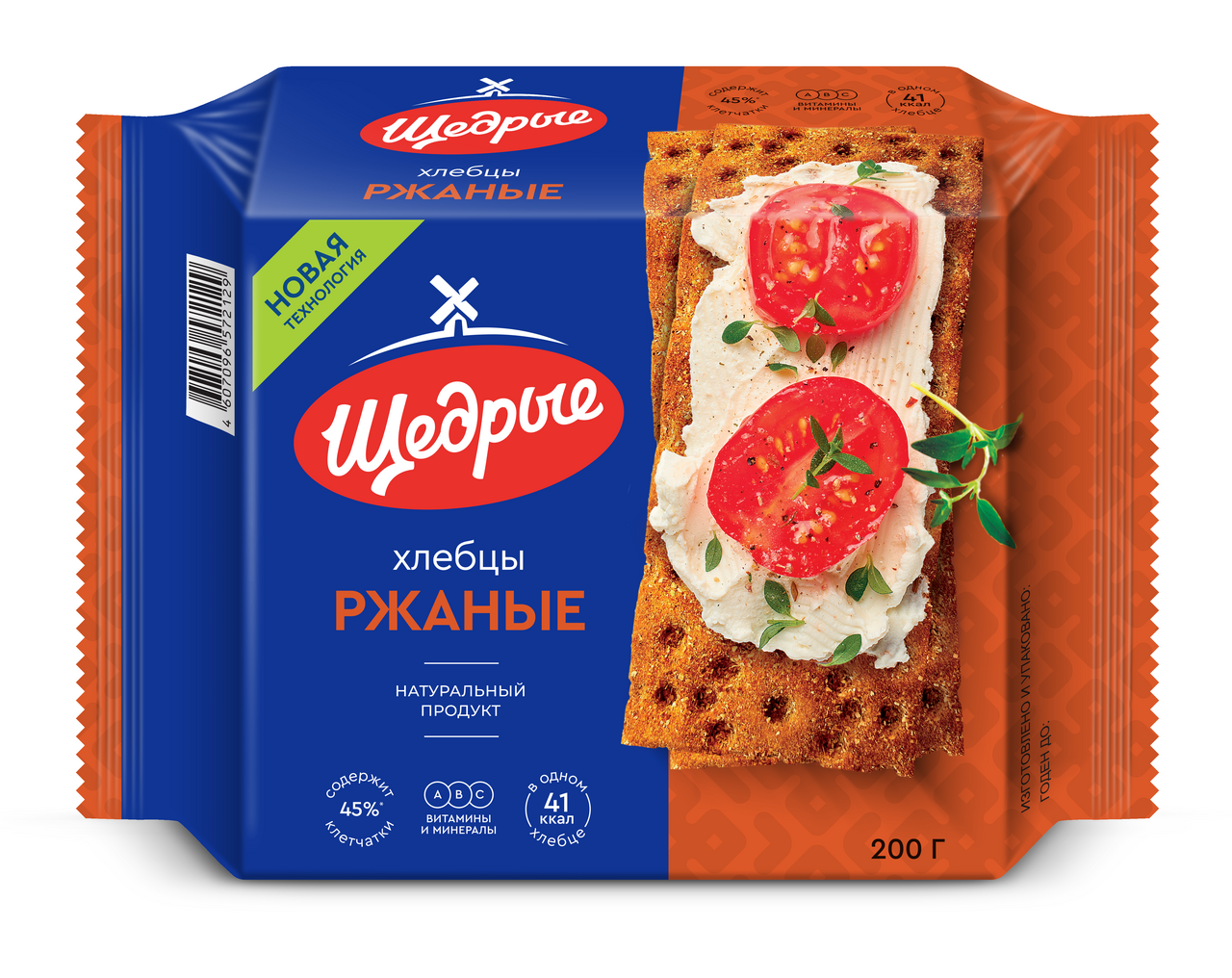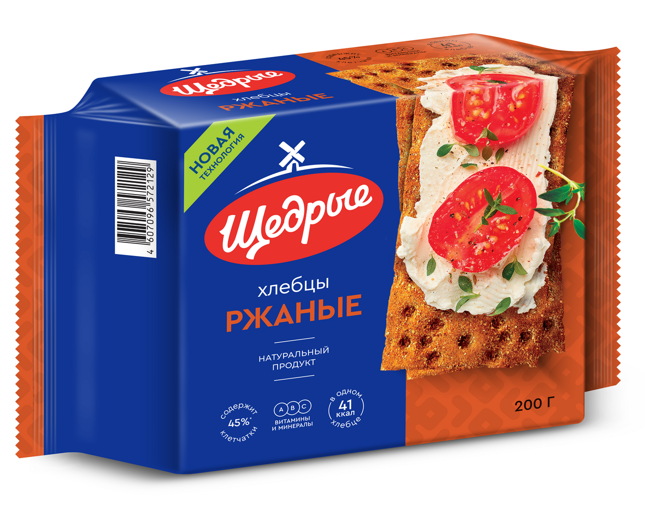 Это современный продукт для тех, кто следит за своим здоровьем и любит разнообразие в еде. В хлебцах Щедрые высокое содержание клетчатки – в 100г содержится 45% от рекомендуемой суточной потребности взрослого человека в пищевых волокнах.