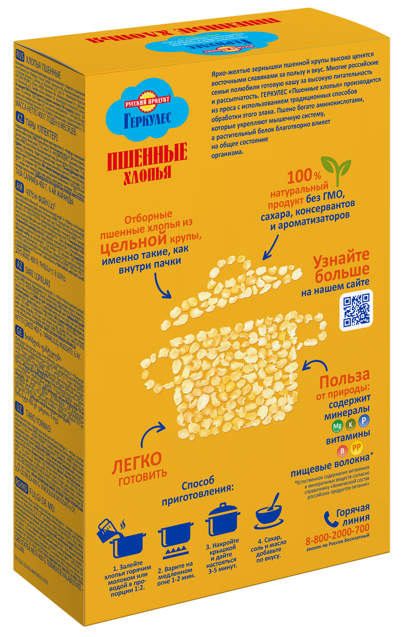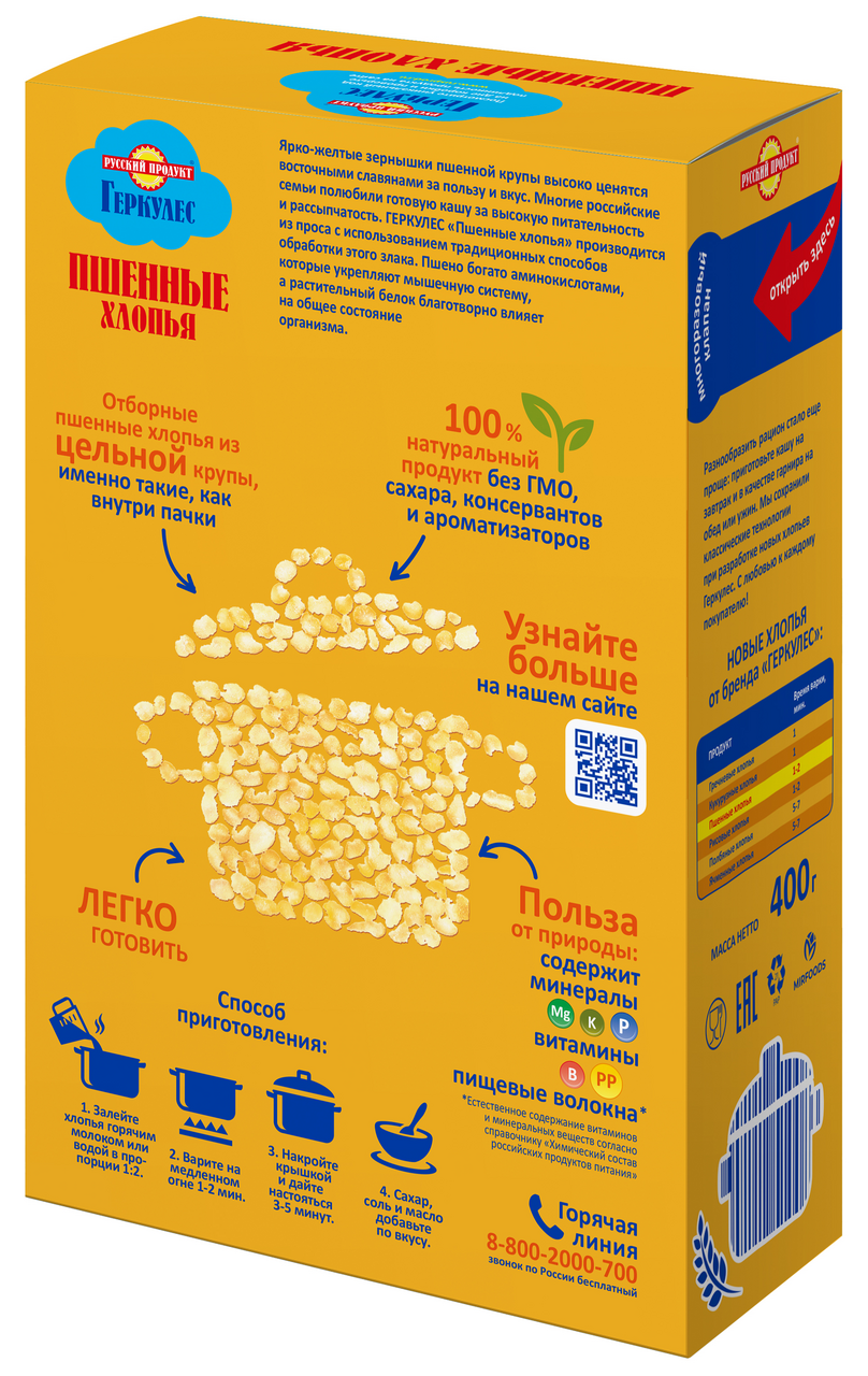 Ценятся за пользу и вкус. Каша из пшенных хлопьев питательна, имеет рассыпчатую структуру, не слипается. Хлопья пшенные производятся из проса с использованием традиционных способов обработки этого злака. Пшено богато аминокислотами, которые укрепляют мышечную систему, а растительный белок благотворно влияет на общее состояние организма.