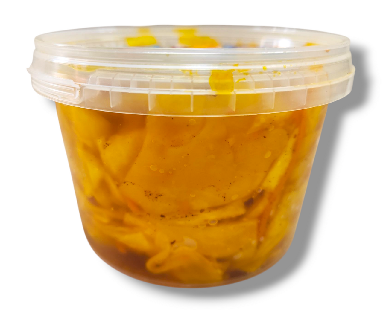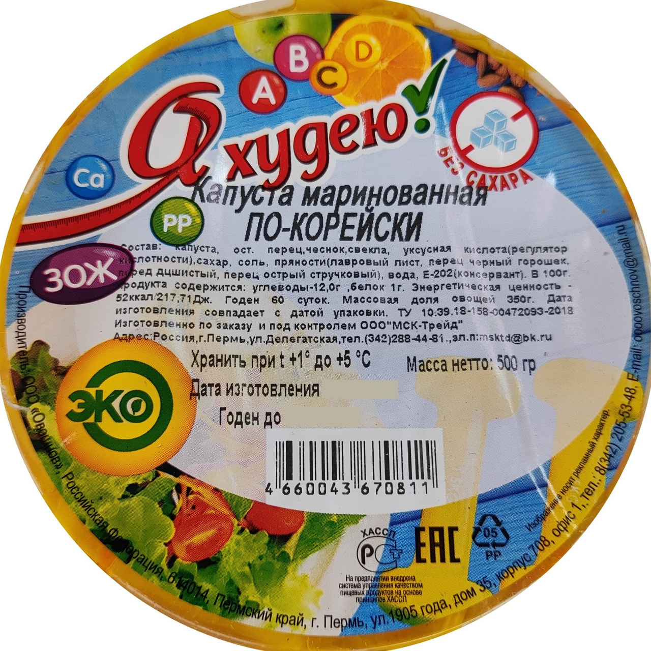 Капуста, острый перец, чеснок, свекла, уксусная кислота (регулятор кислотности), сахар, соль, пряности (лавровый лист, перец черный горошек, перец душистый, перец острый стручковый), вода, Е202 (консервант).