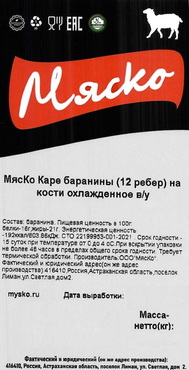Каре из баранины Мяско Халяль 12 ребер на кости охлажденное, ~2кг