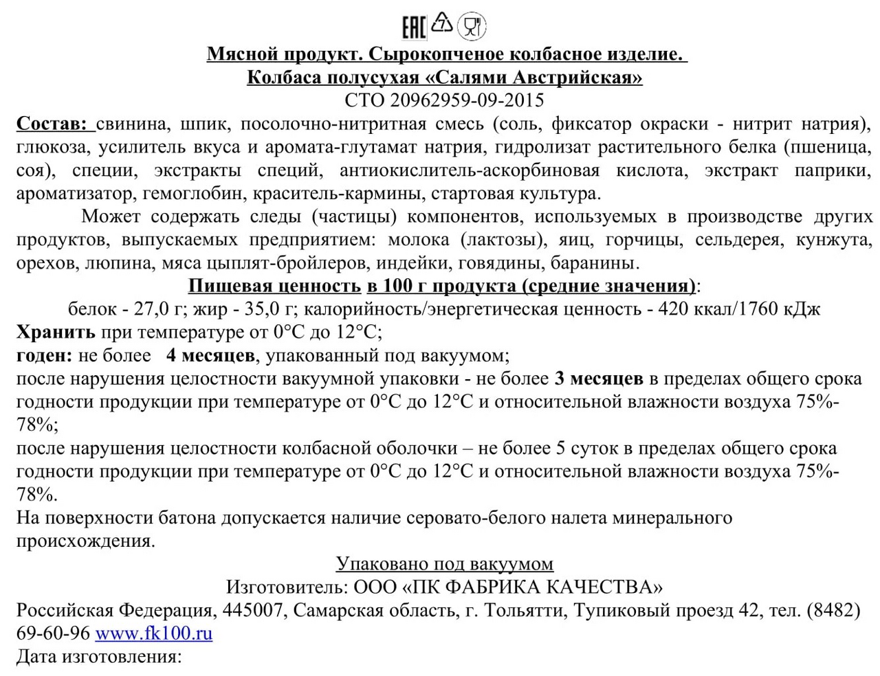 Свинина, шпик, посолочно-нитритная смесь (соль, фиксатор окраски - нитрит натрия), глюкоза, усилитель вкуса и аромата - глутамат натрия, гидролизат растительного белка (пшеница, соя), специи, экстракты специй, антиокислитель - аскорбиновая кислота, экстракт паприки, ароматизатор, гемоглобин, краситель - кармины, стартовая культура.