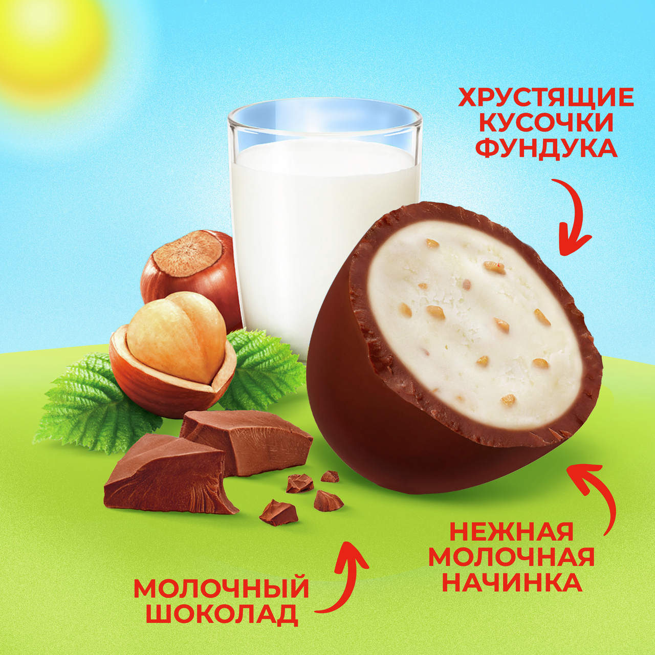 Cахар, сухое обезжиренное молоко, сухое цельное молоко, масло какао, растительный жир, лесные орехи, тёртое какао, обезвоженный молочный жир, эмульгатор: лецитины, глазирователь: гуммиарабик, глюкозный сироп, вода, ароматизатор, регулятор кислотности: лимонная кислота.