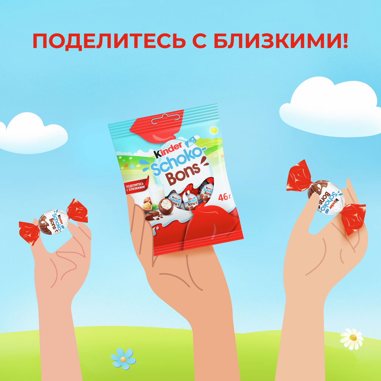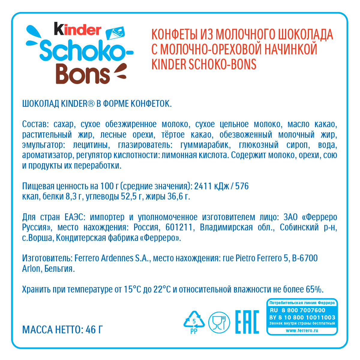 KinderSchoco-Bons (Киндер Шоко-Бонс) - это нежная молочная начинка, кусочки лесных орехов и неповторимый вкус шоколада. Kinder Schoco-Bons производится на одной из фабрик компании Ferrero в Бельгии, славящейся своими шоколадными традициями. Удобные пакетики разных размеров (46 г и 125 г) подойдут и для скромной, и для большой компании! Конфетки в индивидуальной упаковке удобно брать с собой. Дома, в школе, на прогулке – наслаждайтесь сами, радуйте друзей и близких каждый день!