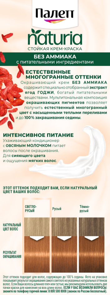 Содержит специально подобранный экстракт ягод Годжи, богатых питательными веществами. Мультитональные окрашивающие пигменты позволяют получить естественный многогранный цвет, сияющие русые оттенки и до 100% закрашивания седины. Ухаживающий кондиционер с овсяным молочком питает волосы изнутри. Для ухоженных волос и естественных живых оттенков. Окрашивающий крем содержит масло Ши, богатое полезными веществами. Ухаживающий кондиционер с овсяным молочком питает и увлажняет волосы изнутри, а мультитональные окрашивающие пигменты позволяют получить естественный русый цвет и до 100% закрашивания седи....