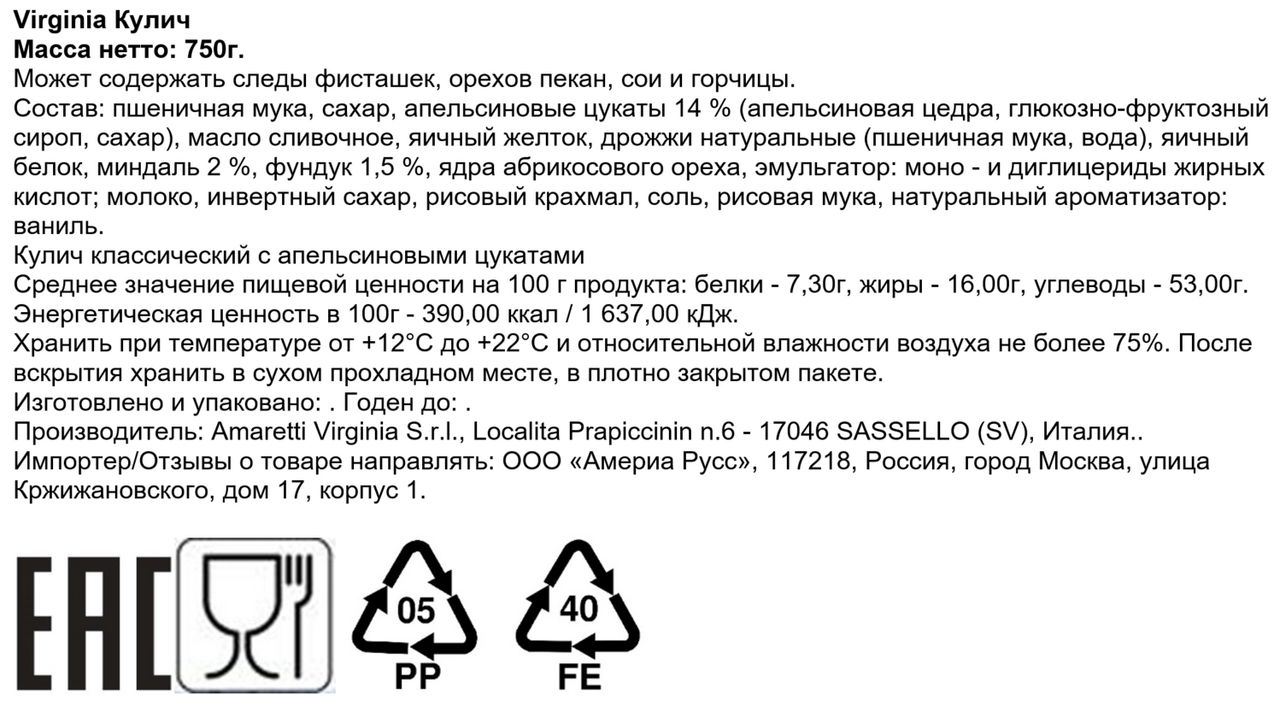 Пшеничная мука, сахар, апельсиновые цукаты 14 % (апельсиновая цедра, глюкозно-фруктозный сироп, сахар), масло сливочное, яичный желток, дрожжи натуральные (пшеничная мука, вода), яичный белок, миндаль 2 %, фундук 1,5 %, ядра абрикосового ореха, эмульгатор: моно - и диглицериды жирных кислот, молоко, инвертный сахар, рисовый крахмал, соль, рисовая мука, натуральный ароматизатор: ваниль.