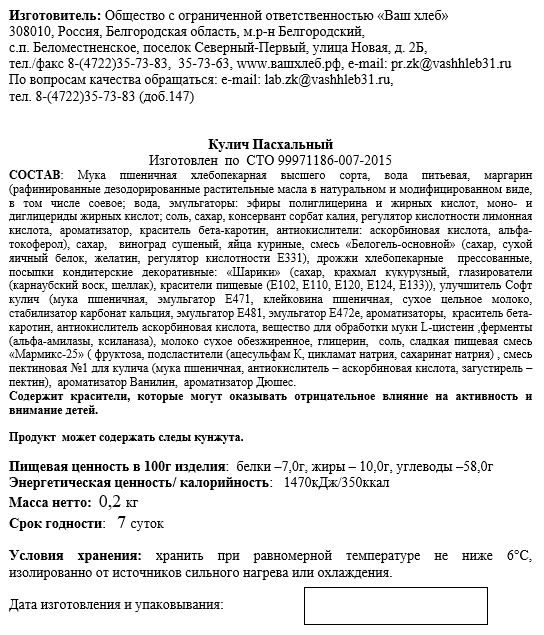 Мука пшеничная хлебопекарная высшего сорта, вода питьевая, сахар, маргарин (рафинированные дезодорированные масла в натуральном и модифицированном виде (подсолнечное масло, пальмовое масло), вода, эмульгаторы (е471, е322), соль поваренная пищевая, ароматизатор "сливки-молоко", краситель е160а, регулятор кислотности лимонная кислота, соевый лецитин, изюм, яйца куриные, смесь белогель (сахар, сухой яичный белок, носитель е460, загуститель е466).