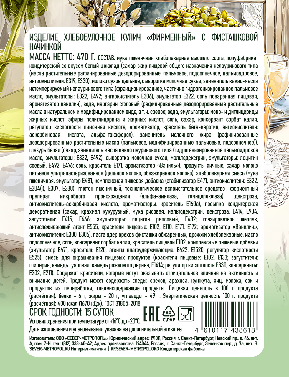 Кулич Север Фирменный с фисташковой начинкой, 470г