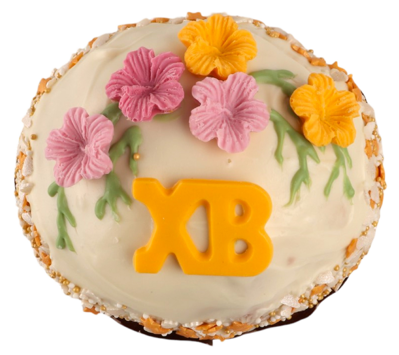 Кулич из сдобного дрожжевого теста, без изюма и цукатов. Наполнен начинкой с кремом со вкусом белого шоколада и пастой ядер жареной фисташки. Поверхность глазируется белым покрытием, украшается цветной кондитерской посыпкой и декором из кондитерской глазури в виде разноцветных цветков и букв ХВ.