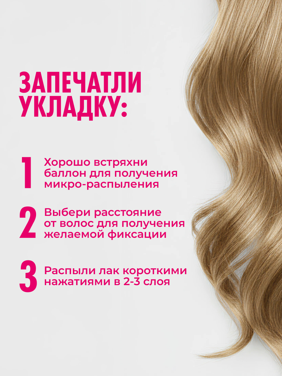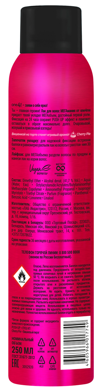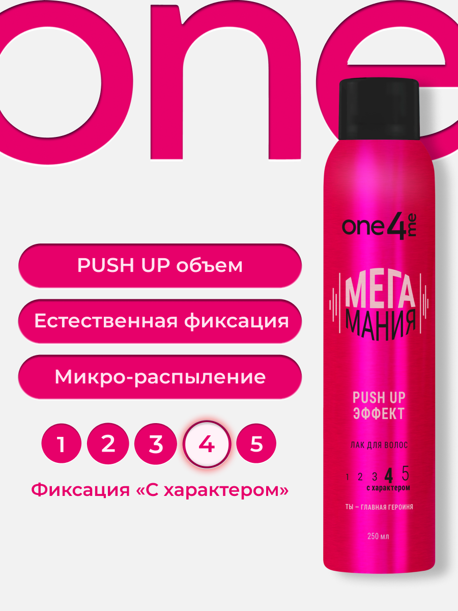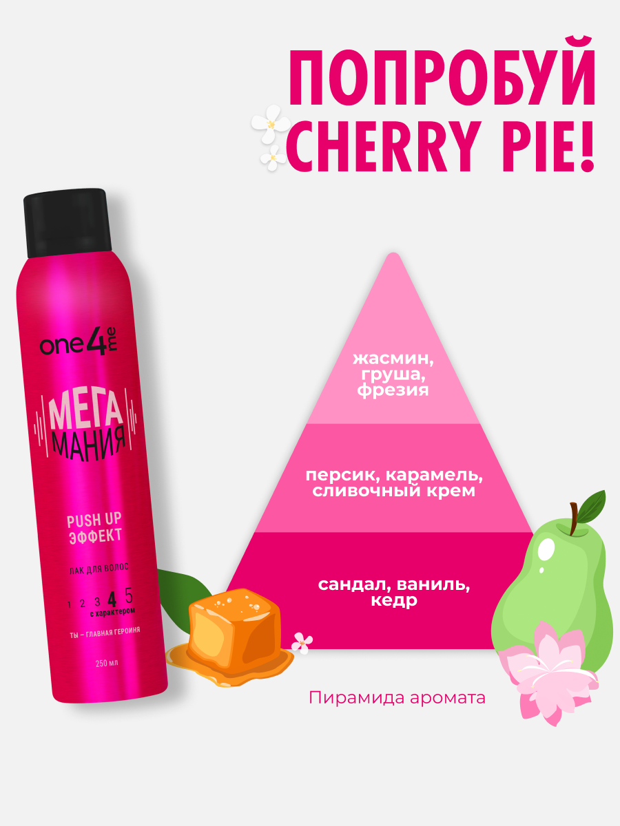 Лак для волос Мегамания от One4me - мегаобъем, эффект пуш-ап и стойкая фиксация на 24 часа. Представляем Мегаманию от one4me - лак для волос, который подарит вашим волосам мегаобъем и эффект приподнятости, обеспечивая при этом стойкую фиксацию до 24 часов. Забудьте о прическах, которые теряют форму в течение дня: с Мегаманией ваша укладка будет безупречной с утра до вечера. Мегаобъем: специальная формула лака придает волосам максимальный объем, создавая эффект приподнятых волос. Фиксация с характером: уникальный распылитель обеспечивает микро-распыление и стойкую фиксацию (4/5) до 24 часов, позволяя создавать любые образы и не беспокоиться о сохранности прически. Уникальный распылитель: равномерное нанесение для идеальной фиксации без утяжеления. Аромат вишневого пирога: Насладитесь игривым и соблазнительным ароматом вишневого пирога. Простота в использовании: подходит для ежедневного применения и легко смывается шампунем. Идеально подходит для: создания объемных причесок, начесов, укладок для особых случаев и ежедневного стайлинга.