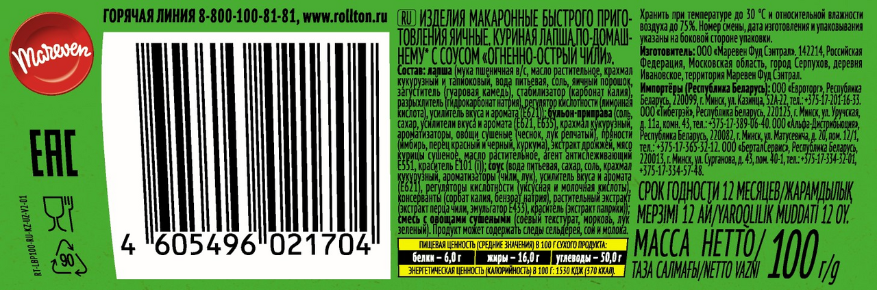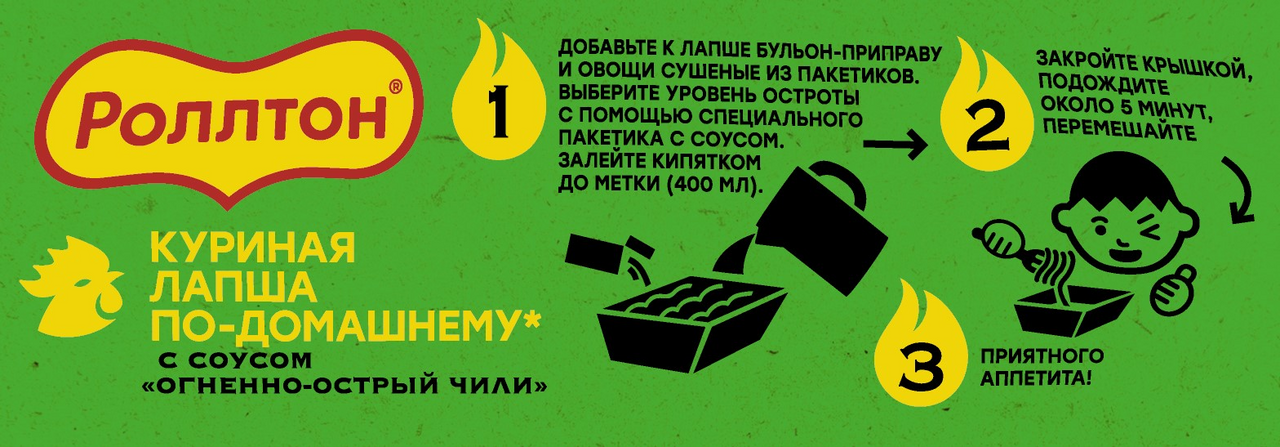 Если любишь погорячее - выбирай Роллтон С огоньком. Яркий вкус и аромат натуральных сушеных овощей в удобной упаковке легко утолят голод и подарят запас новых сил, где бы ты не находился. А еще ты можешь сам управлять своей остротой, добавляя столько соуса, сколько хочешь. Это макаронное изделие быстрого приготовления с добавлением кусочков курицы, пряностей, чеснока. Вы сами можете выбрать сделать лапшу острой или более мягкой по вкусу используйте для этого соус с перцем чили. Быстрота и легкость в приготовлении способствуют ее популярности у разных категорий покупателей. Ее берут в поездки, походы или для перекуса на работе.