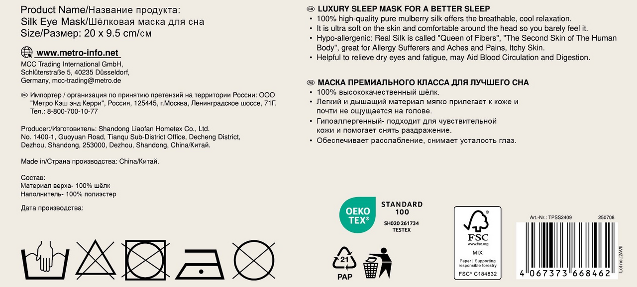 100% высококачественный шёлк, легкий и дышащий материал мягко прилегает к коже и почти не ощущается на голове. Гипоаллергенный- подходит для чувствительной кожи и помогает снять раздражение. Обеспечивает расслабление, снимает усталость глаз.