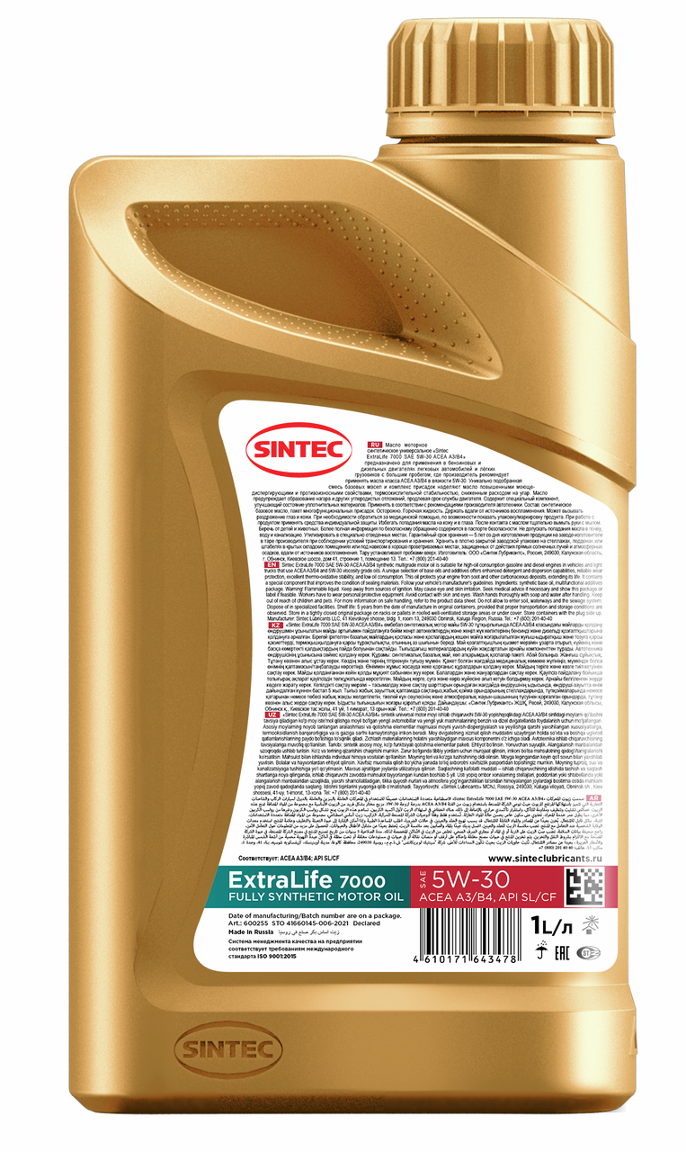 Синтетическое моторное масло Sintec ExtraLife 7000 5W-30 A3/B4 SL/CF разработано специально для автомобилей с большим пробегом. Увеличенное содержание противоизносных присадок, высокая термоокислительная стабильность и запас моющих свойств способствуют уменьшению износа двигателей с пробегом более 150 00км. Технология ActiveSeal позволяет предотвратить протечки за счёт добавления специального кондиционера, сохраняющего эластичность резиновых уплотнений.