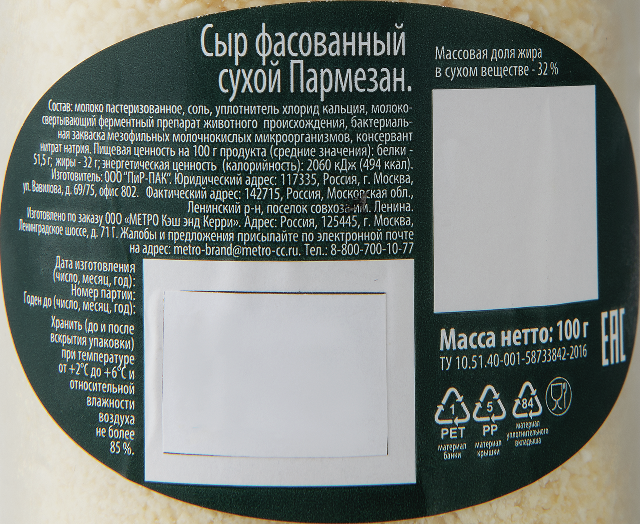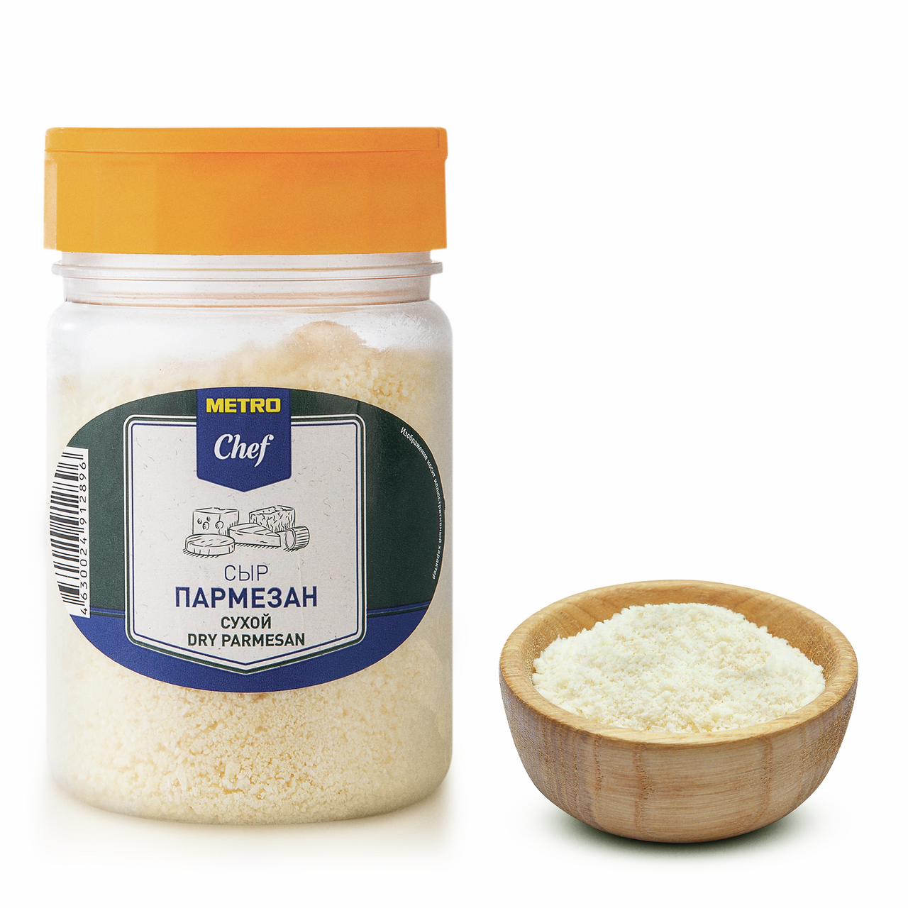 Metro Chef Сыр Пармезан сухой 32%, 100г обладает ярким, сложным и многогранным вкусом с легкими фруктовыми нотками, сливочно-ореховым послевкусием. Аромат этого сырного порошка глубокий и пряный никого не оставит равнодушным.