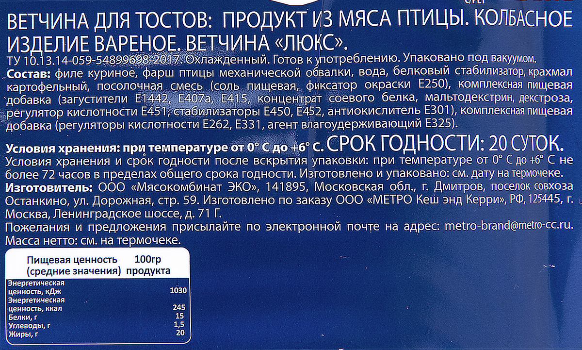 METRO Chef Ветчина с курицей для тостов, 500г изготовлена из мяса птицы и не содержит ГМО. Помимо этого, в ее состав входят и пикантные, ароматные специи. Продукт можно подавать как самостоятельное блюдо, так и делать с ним бутерброды и различные закуски, например, рулетики с ветчиной и сыром, добавлять в первые и вторые блюда, использовать при приготовлении пиццы и в качестве начинки для пирогов. Благодаря тому что ветчина уже нарезана на тонкие ломтики, упаковку удобно брать с собой на пикник, в поездку или на работу.