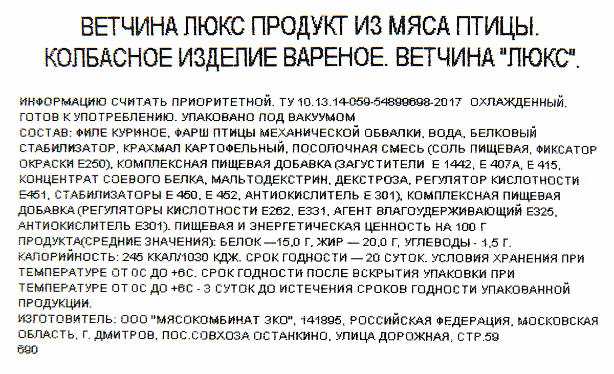Филе куриное, фарш птицы механической обвалки, вода, белковый стабилизатор, крахмал картофельный, посолочная смесь (соль пищевая, фиксатор окраски Е250), комплексная пищевая добавка (загустители Е1442, Е407А, Е415, концентрат соевого белка, мальтодекстрин, декстроза, регулятор кислотности Е451, стабилизаторы Е450, Е452, антиокислитель Е301), комплексная пищевая добавка (регуляторы кислотности Е262, Е331, агент влагоудерживающий Е325, антиокислитель Е301).