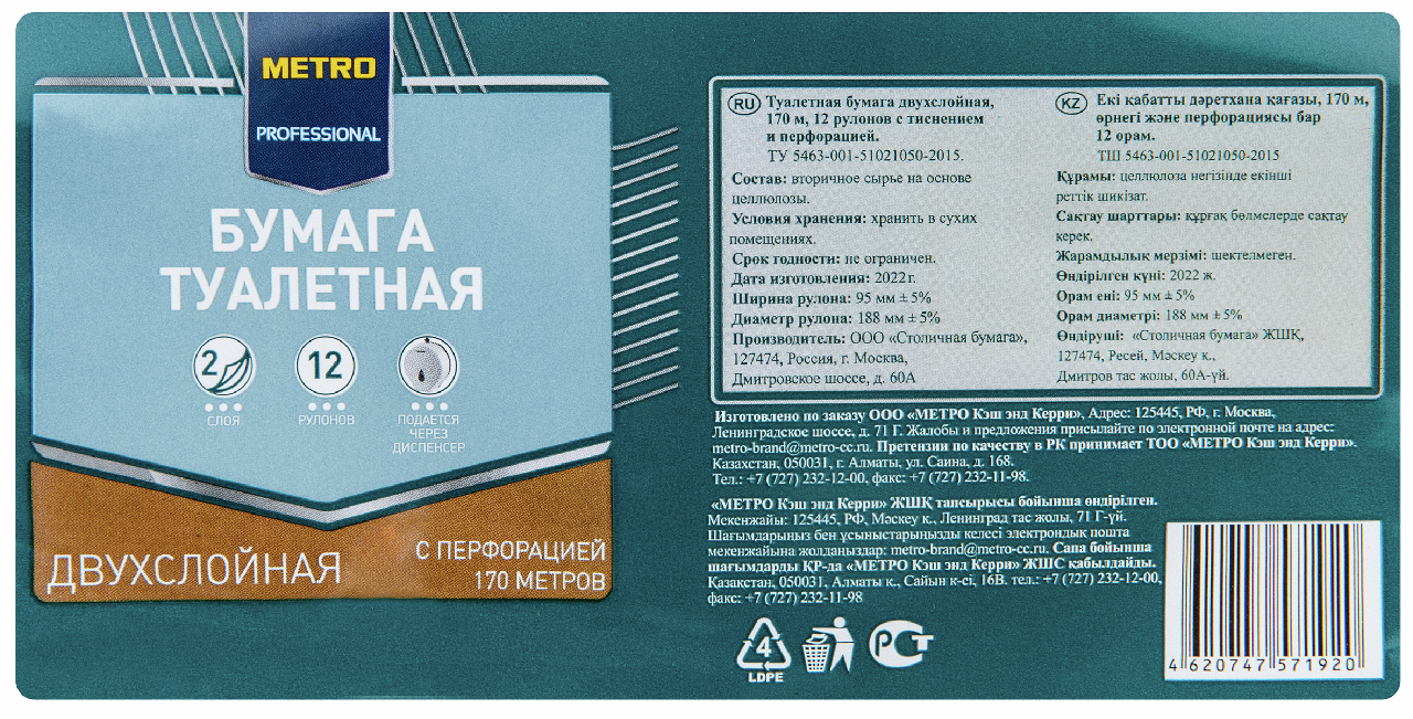 METRO PROFESSIONAL Туалетная бумага Т1 170м 2-слойная, 12 рулонов