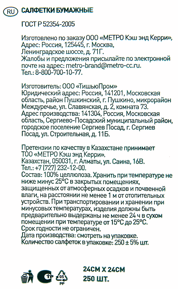 METRO PROFESSIONAL Салфетки бумажные 3 слоя белые 250шт, 24х24см