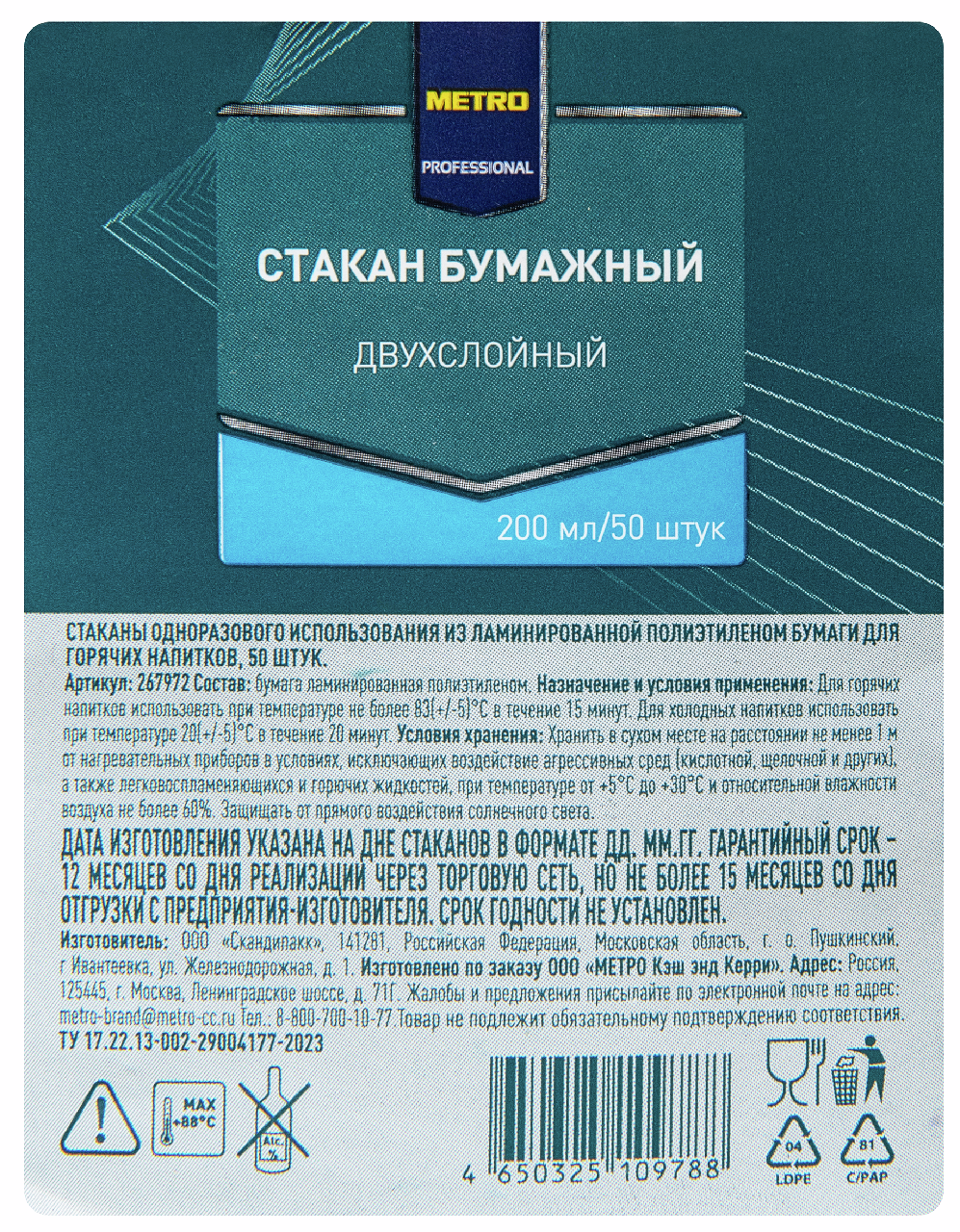 METRO PROFESSIONAL Стакан бумажный двуслойный зерно 200мл, 50шт