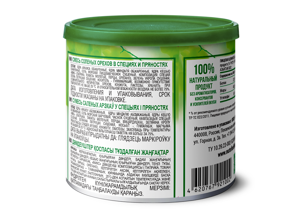 Ореховая смесь с натуральными специями и розовой морской солью. В ее состав входит обжаренный миндаль, кешью и арахис. Микс отличается приятным вкусом и натуральным составом. Орехи подходят в качестве перекуса и сопровождения к пиву. Благодаря жестяной баночке, их удобно брать с собой. Кроме того, ореховый микс благоприятно воздействует на здоровье человека. Он снижает количество вредного холестерина в крови, укрепляет сердце и сосуды.
