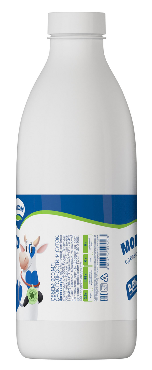 Молоко питьевое пастеризованное жирностью 2,5%, упаковано в пластиковую бутылку (ПЭТ) объемом 0,9 литра. Подходит для ежедневного употребления, приготовления блюд и напитков. Содержит витамины группы B, кальций и белок, необходимые для поддержания здоровья организма.