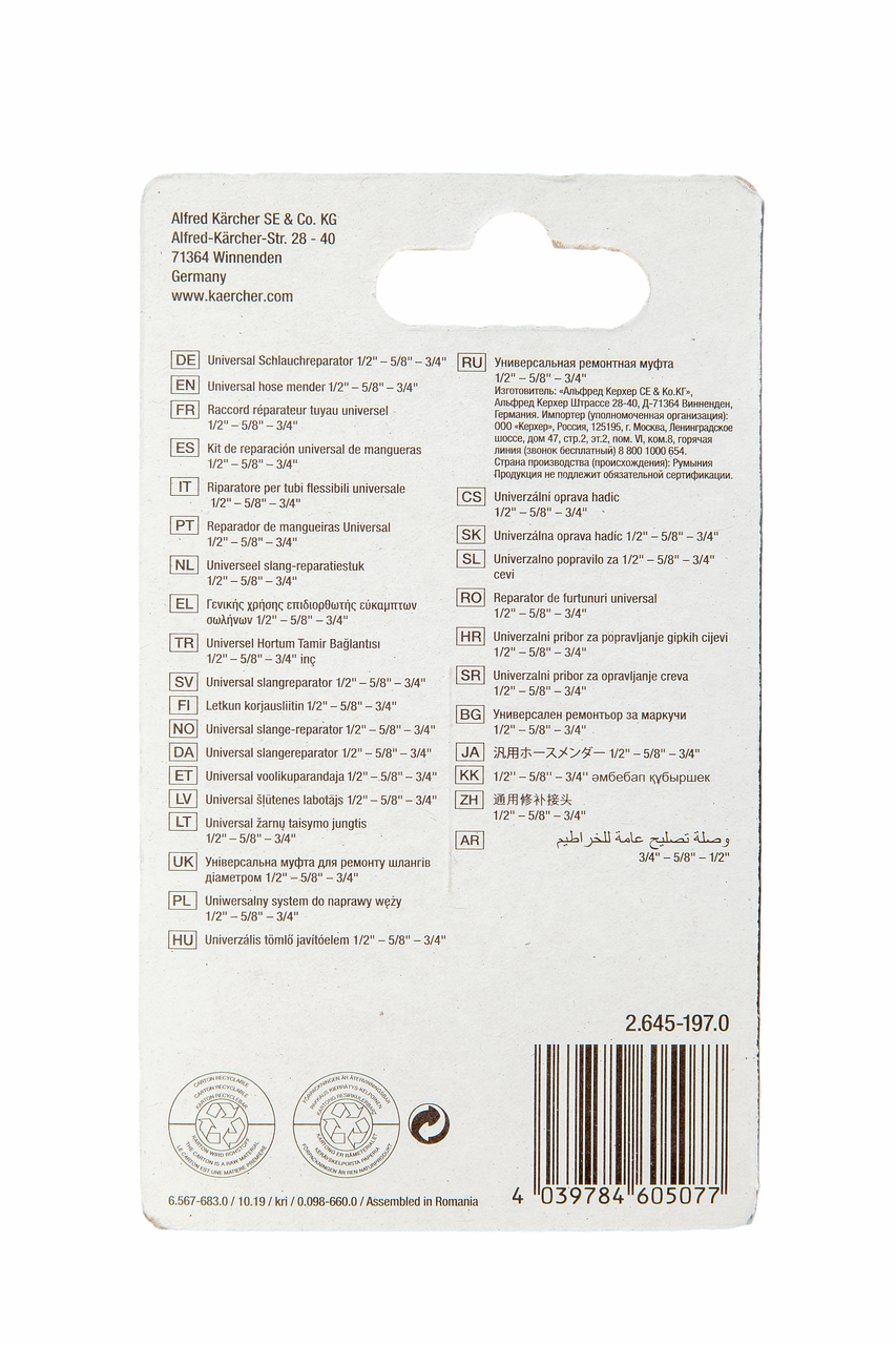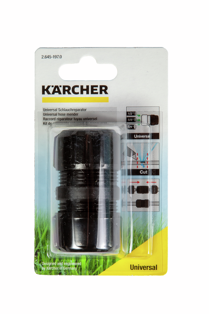 Муфта Karcher ремонтная универсальная 1/2, 5/8, 3/4 подходит для всех ходовых типов садовых шлангов и подкупает эргономичной конструкцией и удобным обращением. Идеальное решение для ремонта или соединения двух кусков шланга. Универсальная ремонтная муфта для шлангов совместима с тремя самыми ходовыми диаметрами шлангов. Она подходит для соединения двух шлангов или ремонта поврежденного шланга.