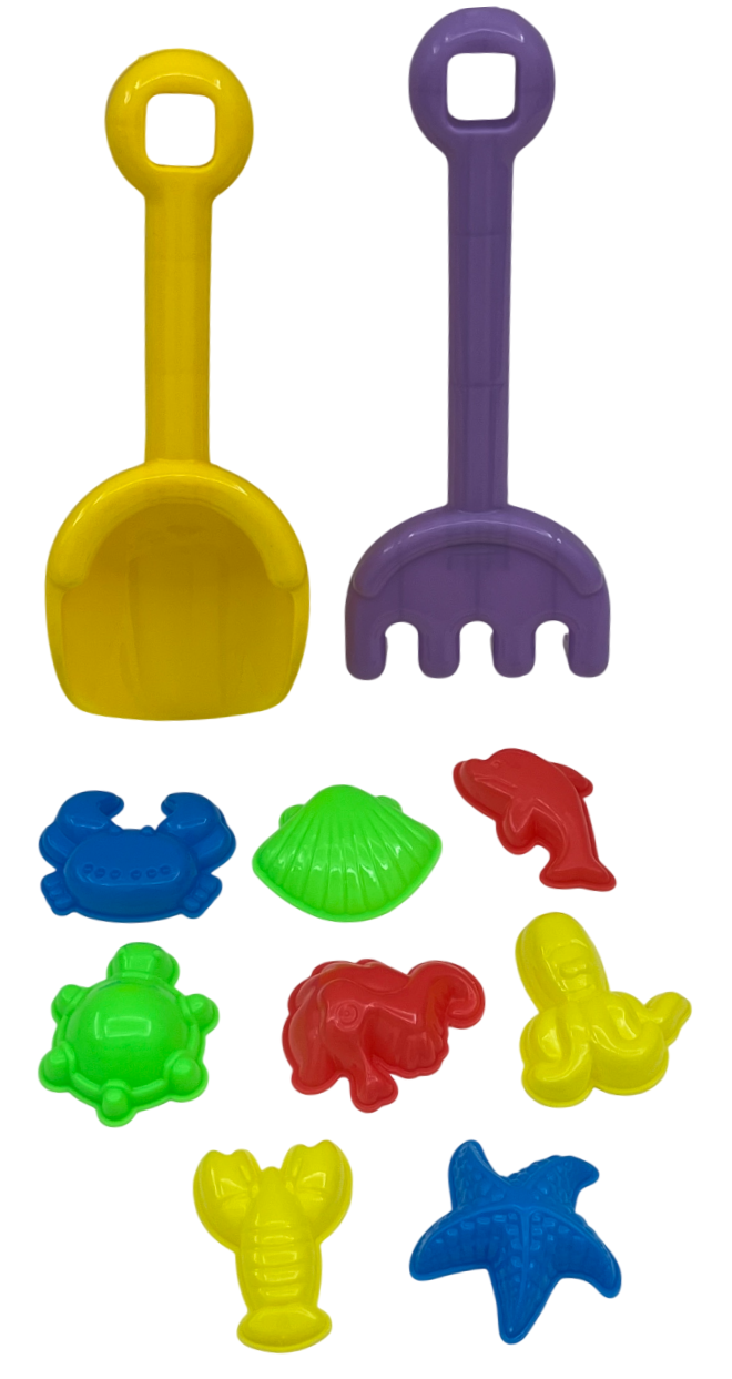 Набор для игры в песочнице. В комплект входят 10 предметов: лопатка - 1шт, грабли - 1шт, формочки - 8шт. Предназначен для летних игр в песочнице. Все предметы выполнены из прочного и безопасного пластика.