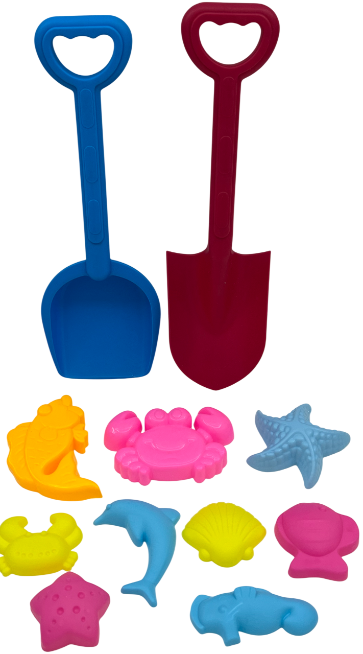 Набор для игры в песочнице. В комплект входят 11 предметов: лопатка - 2шт, формочки - 9шт. Предназначен для летних игр в песочнице. Все предметы выполнены из прочного и безопасного пластика.