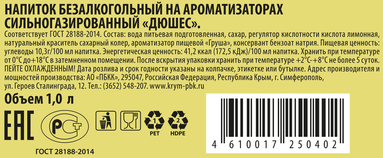 Дюшес (от франц. duchesse, буквально - герцогиня) - сладкий безалкогольный газированный напиток, созданный на основе вкусовых и ароматических композиций десертных сортов груши с нежной, сочной и сладкой мякотью. Дюшес стал отличным дополнением к уже известной серии ретро-напитков ПБК Крым, которые производятся только на натуральном сырье: прекрасно сбалансированная очищенная вода, сахар и сахарный колер.
