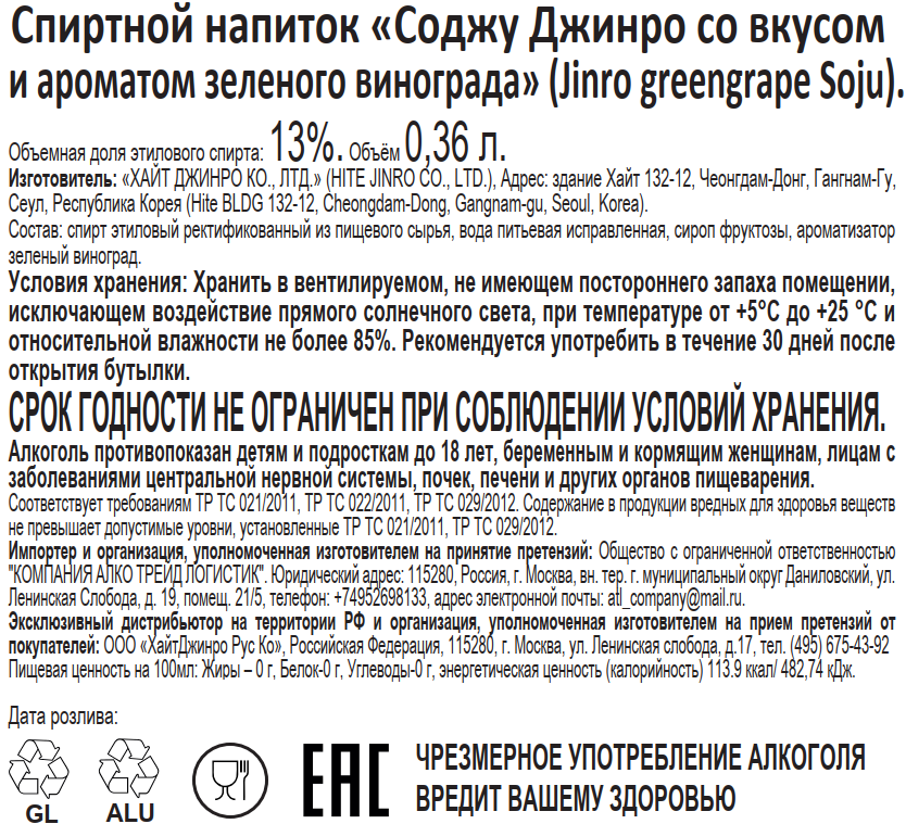 Напиток спиртной Soju Jinro зеленый виноград, 0.36л