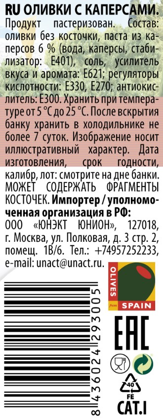 Оливки, каперсы, вода, соль, подкислители (молочная кислота Е270, лимонная кислота Е330), усилитель вкуса глюконат натрия Е621, стабилизатор натриевый альгинат Е-401, антиоксидант аскорбиновая кислота Е300.